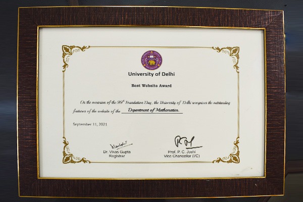 The Website of the Department of Mathematics received “Best Website Award” on 99th Foundation Day of the University held on September 11, 2021. Link